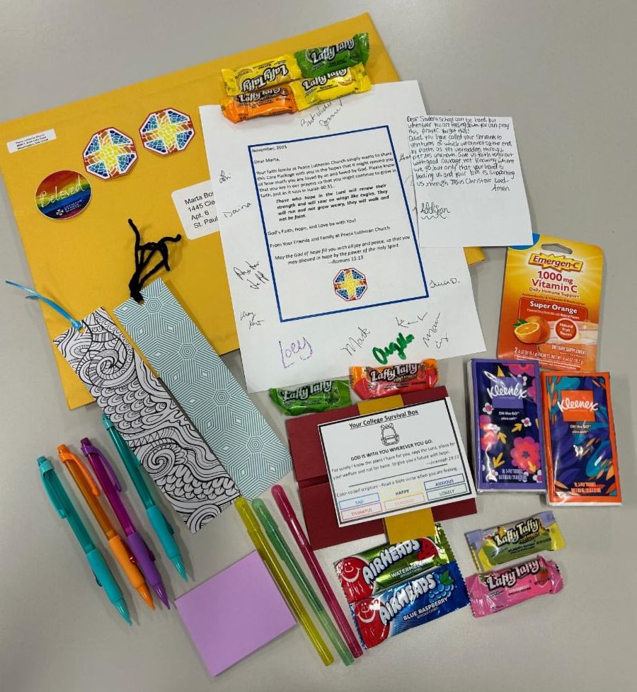 Last week at Confirmation we talked about the presence of the Holy Spirit in our lives, and then we talked about the importance of bringing that same Spirit to worship on Sunday mornings when serving as an Usher or a Greeter. On Saturday we will spend the day at Augsburg University on an “Urban Plunge” retreat – our “suburban” kids will get to experience an “urban” setting in a new way. (Did you know that the Cedar-Riverside Neighborhood is one of the most ethnically diverse neighborhoods in the entire country?) Finally, these kids wrote notes that were included in the Care Packages that were sent to all of our college age members. Also included in the care packages were pens, pencils, post-it notes, bookmarks, and other fun items! See below for pictures!